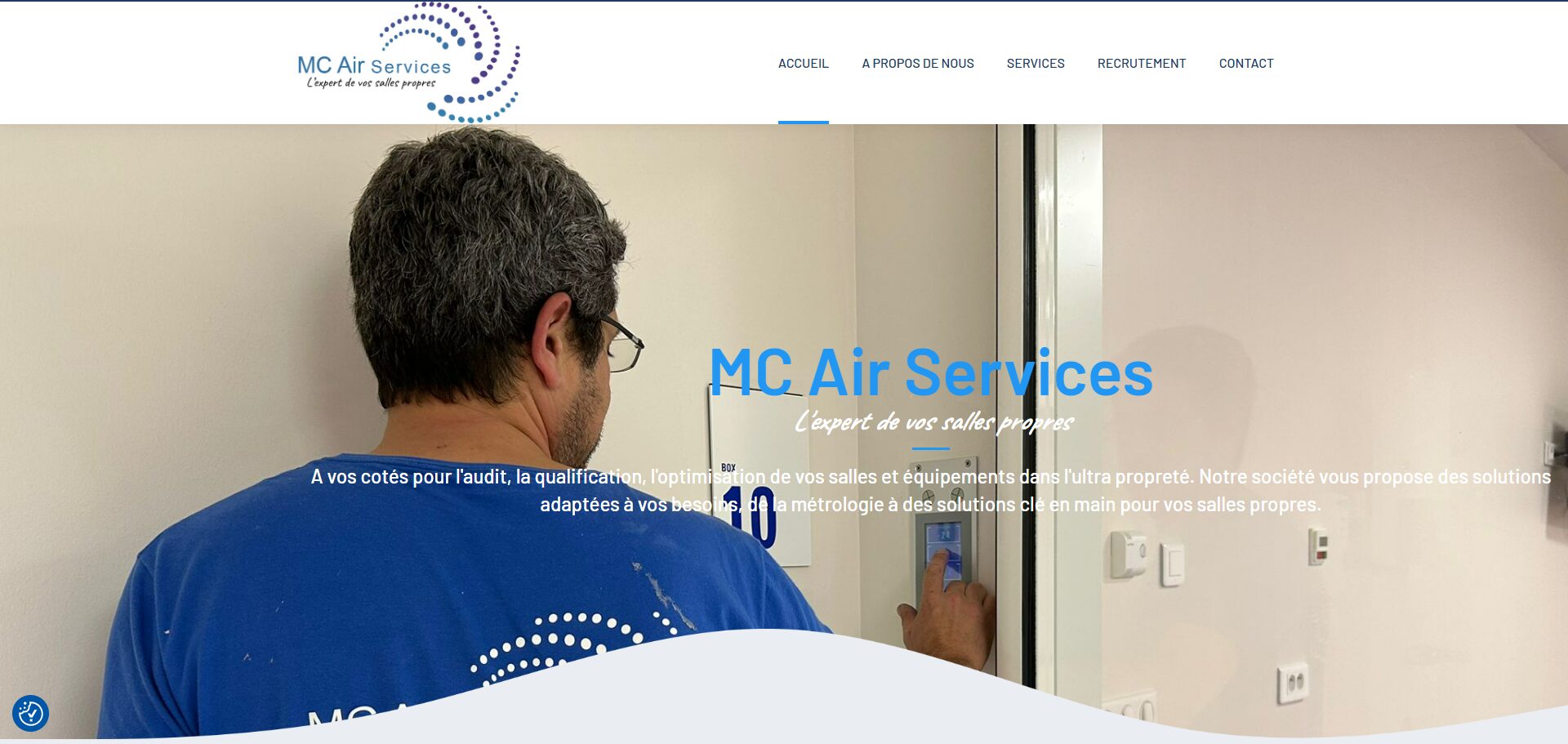 Création d'un site vitrine et d'un logo pour MC Air Services, entreprise spécialisée dans les salles propres (hôpitaux - industrie pharmaceutique - aérospatial) avec contrôles et audits, basée à Saint-Séverin, Charente (16).