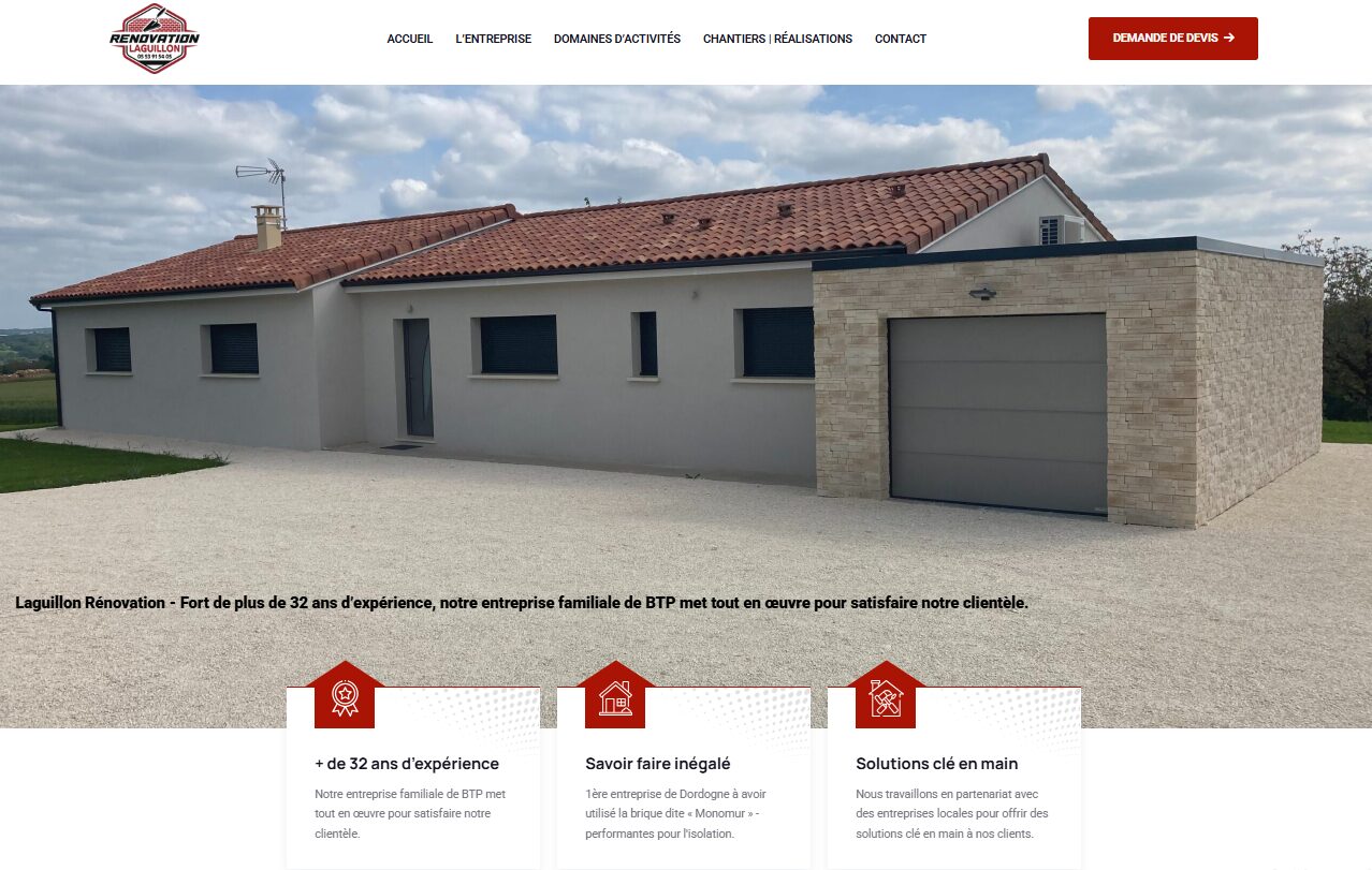 Création d'un site vitrine pour Laguillon Rénovation, entreprise familiale de BTP (terrassement - maçonnerie - couverture - zinguerie etc) avec plus de 30 ans d'expérience, basée à Saint-Paul-Lizonne, Dordogne (24).