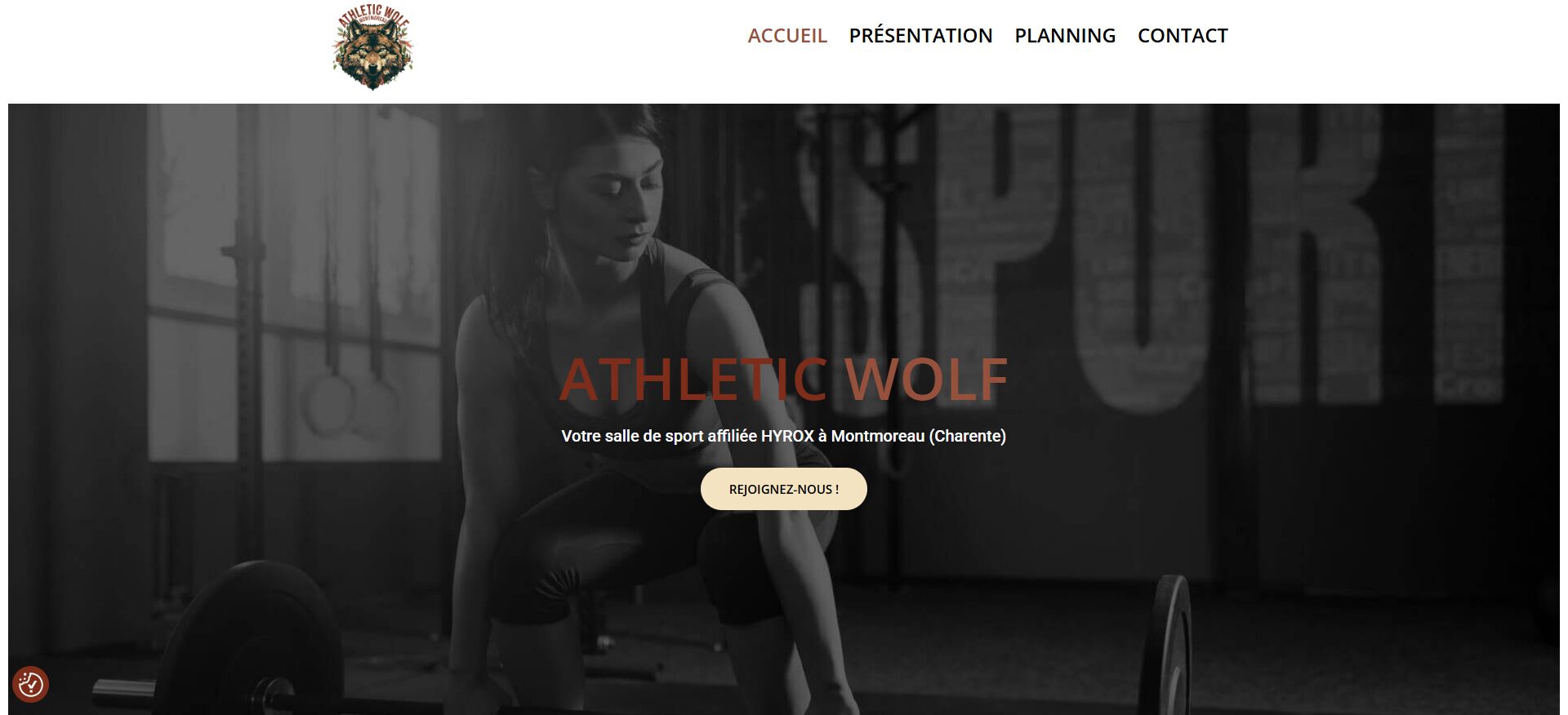 Création d'un site vitrine pour la salle de sport Athletic Wolf proposant des functional trainings / crossfit / pilates, affilée Hyrox, basée à Montmoreau, Charente (16).